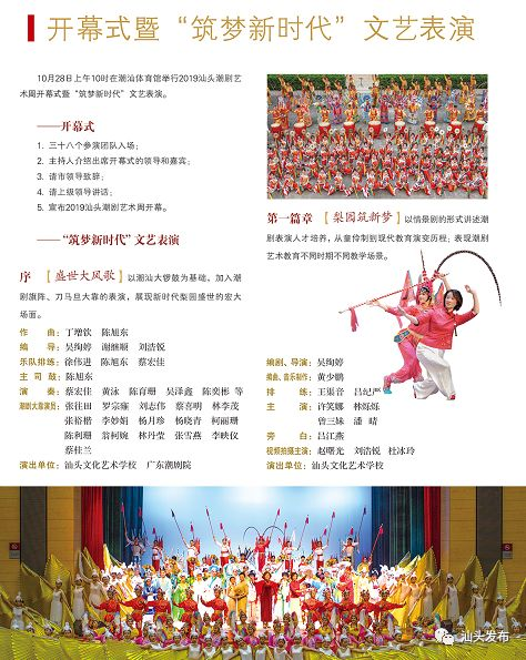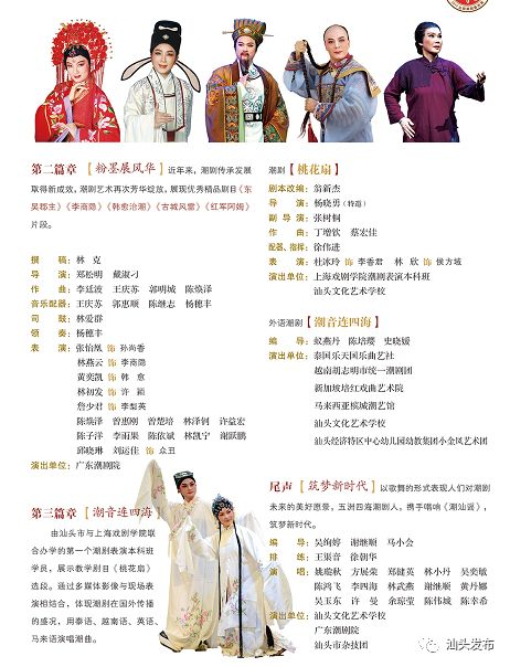 《古城风雷》《韩愈治潮》《红军阿姆》《李商隐》《东吴郡主》《桃花扇》等经典潮剧剧目片段都将在开幕式中上演,汕头人熟悉的林初发、黄奕凯、詹少君、林燕云、张怡凰等演员都将登台献演。