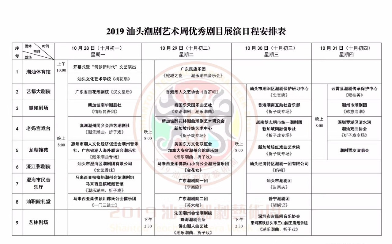2019汕头潮剧艺术周将于10月27日至31日在我市举办,主题为“潮音扬四海、共筑中国梦”。10月28日上午10时,2019汕头潮剧艺术周开幕式将在潮汕体育馆举行,参加2019汕头潮剧艺术周的海内外团体将集体亮相,展示潮剧发展的历程以及取得的丰硕成果。