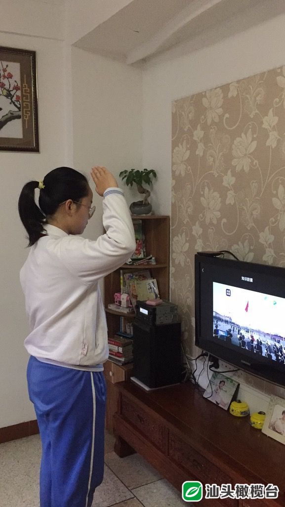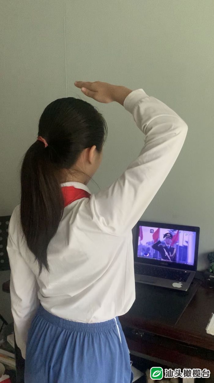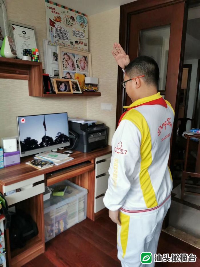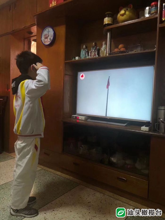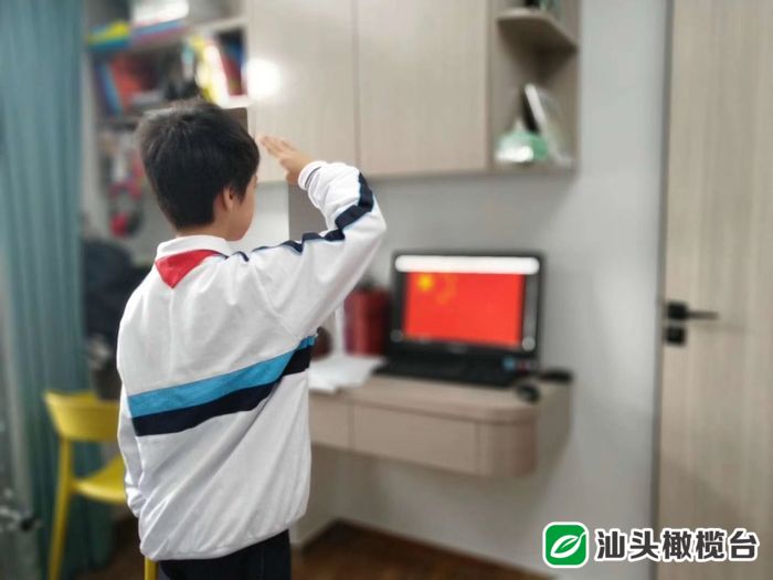 “起来,不愿做奴隶的人们……”雄壮的国歌声响起,学生们在家中参加线上升国旗主题教育仪式,对着冉冉升起的国旗敬礼。