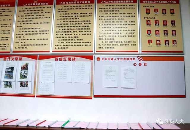 人大代表联络站(室)是人大代表联系选民、服务选区、开展学习培训等的重要载体和平台。今年6月以来,金平区人大常委会积极推进人大代表联络站规范化建设,确定“光华街道人大代表联络站”和“鮀莲街道人大代表联络站”为金平区人大代表联络站建设的联系点,以点带面,推进辖内街道、社区代表联络站规范化建设。截至目前,金平区已建立街道、社区两级代表联络站34个,进站人大代表327人。龙湖区人大常委会通过加强制度建设,不断加强和完善代表联络站建设,在密切联系群众,倾听社情民意,解决群众反映问题等方面,取得良好效果。2017年,龙湖区人大常委会在七个镇(街道)各设立1个代表联络站作为试点。在总结经验的基础上,今年在每个镇(街道)再增设1个人大代表联络站,并于3月底前全部挂牌运作。