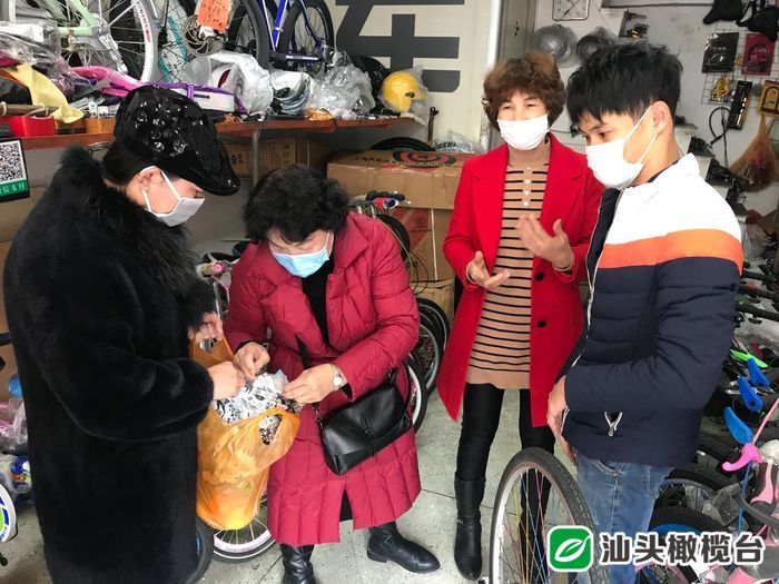 随后,陈映芳又来到金湖路的这家自行车店。店主小李是一名小儿麻痹症患者,靠维修自行车维持生计。最近,小李开工在即,但却找不到口罩,陈映芳得知这一情况,及时为他送来口罩。